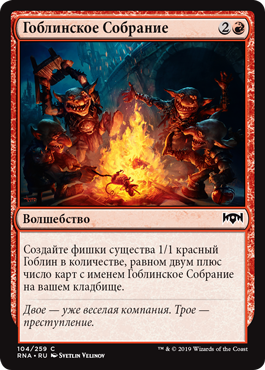 | Rules | Create a number of 1/1 red Goblin creature tokens equal to two plus the number of cards named Goblin Gathering in your graveyard. |