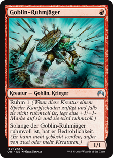 | Rules | Renown 1 (When this creature deals combat damage to a player, if it isn't renowned, put a +1/+1 counter on it and it becomes renowned.) As long as Goblin Glory Chaser is renowned, it has menace. (It can't be blocked except by two or more creatures.) |