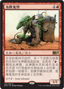 | Rules | At the beginning of your upkeep, create a colorless artifact token named Land Mine with ", Sacrifice this artifact: This artifact deals 2 damage to target attacking creature without flying." Then flip a coin. If you lose the flip, Goblin Kaboomist deals 2 damage to itself. |