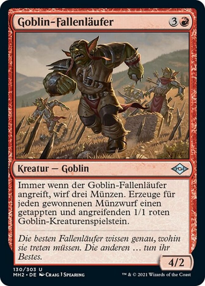 | Rules | Whenever Goblin Traprunner attacks, flip three coins. For each flip you win, create a 1/1 red Goblin creature token that's tapped and attacking. |