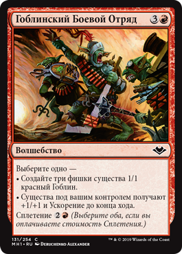 | Rules | Choose one — • Create three 1/1 red Goblin creature tokens. • Creatures you control get +1/+1 and gain haste until end of turn. Entwine (Choose both if you pay the entwine cost.) |
