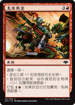| Rules | Choose one — • Create three 1/1 red Goblin creature tokens. • Creatures you control get +1/+1 and gain haste until end of turn. Entwine (Choose both if you pay the entwine cost.) |