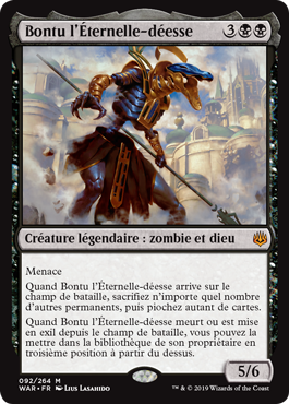 | Rules | Menace When God-Eternal Bontu enters the battlefield, sacrifice any number of other permanents, then draw that many cards. When God-Eternal Bontu dies or is put into exile from the battlefield, you may put it into its owner's library third from the top. |