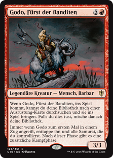 | Rules | When Godo, Bandit Warlord enters the battlefield, you may search your library for an Equipment card, put it onto the battlefield, then shuffle. Whenever Godo attacks for the first time each turn, untap it and all Samurai you control. After this phase, there is an additional combat phase. |