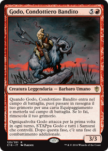 | Rules | When Godo, Bandit Warlord enters the battlefield, you may search your library for an Equipment card, put it onto the battlefield, then shuffle. Whenever Godo attacks for the first time each turn, untap it and all Samurai you control. After this phase, there is an additional combat phase. |