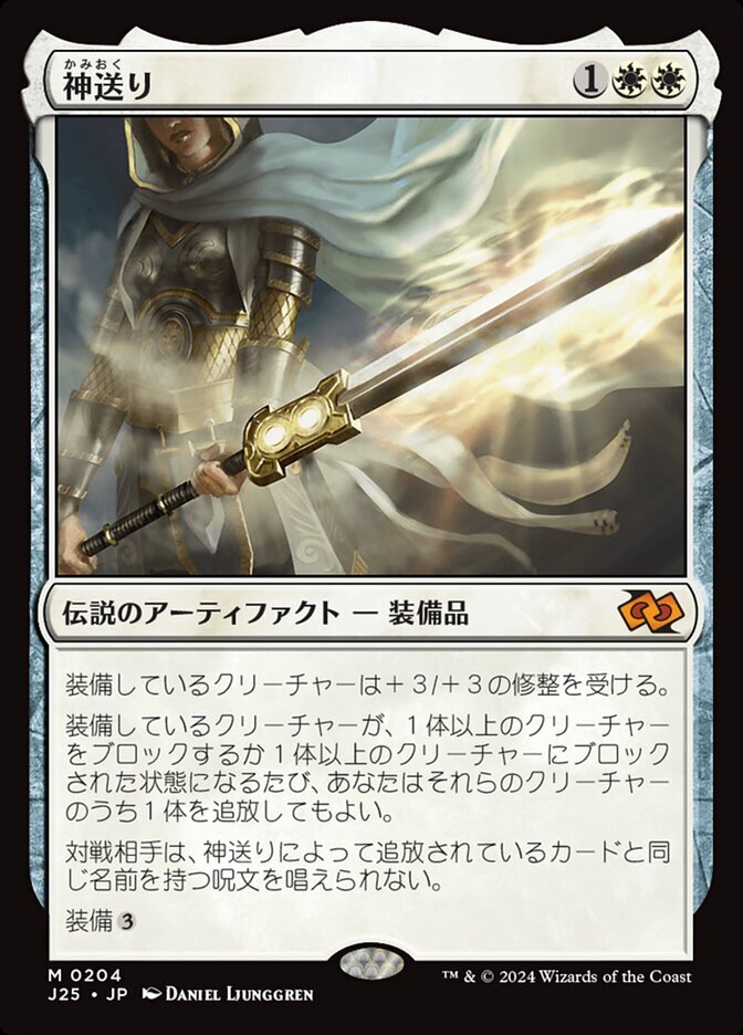 | Rules | Equipped creature gets +3/+3. Whenever equipped creature blocks or becomes blocked by one or more creatures, you may exile one of those creatures. Your opponents can't cast spells with the same name as a card exiled with Godsend. Equip |