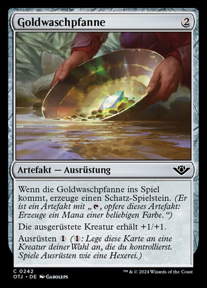 | Rules | When Gold Pan enters the battlefield, create a Treasure token. (It's an artifact with ", Sacrifice this artifact: Add one mana of any color.") Equipped creature gets +1/+1. Equip (: Attach to target creature you control. Equip only as a sorcery.) |
