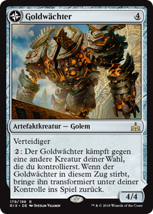 : Golden Guardian fights another target creature you control. When Golden Guardian dies this turn, return it to the battlefield transformed under your control.