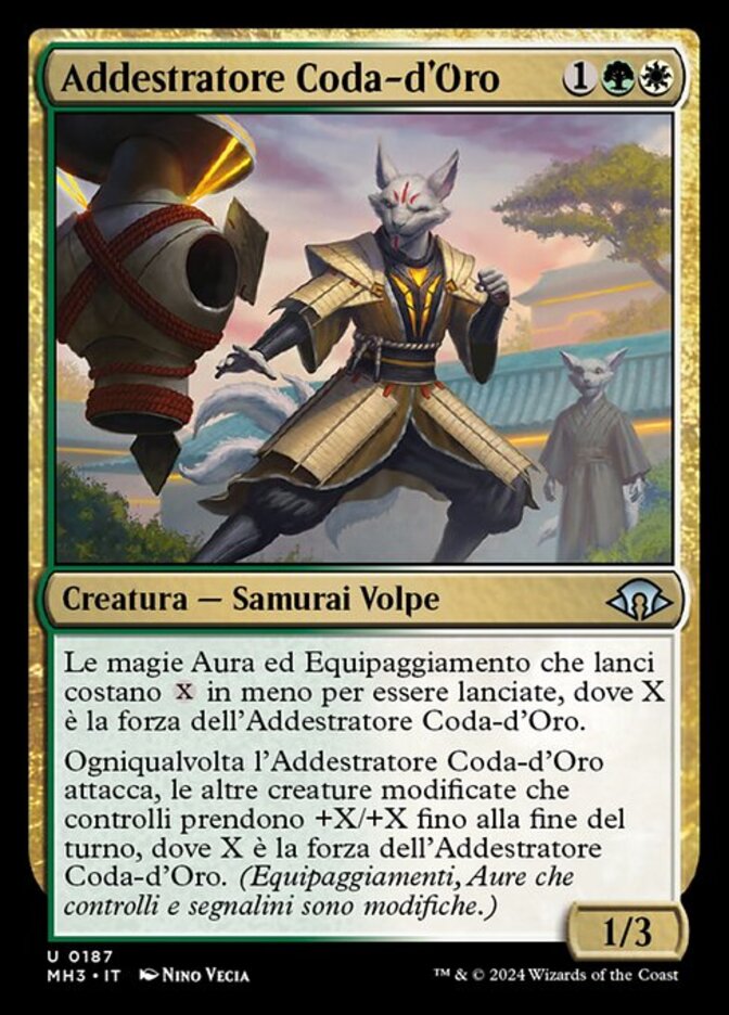 | Rules | Aura and Equipment spells you cast cost less to cast, where X is Golden-Tail Trainer's power. Whenever Golden-Tail Trainer attacks, other modified creatures you control get +X/+X until end of turn, where X is Golden-Tail Trainer's power. (Equipment, Auras you control, and counters are modifications.) |
