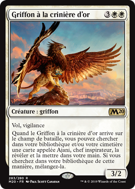 When Goldmane Griffin enters the battlefield, you may search your library and/or graveyard for a card named Ajani, Inspiring Leader, reveal it, and put it into your hand. If you search your library this way, shuffle.