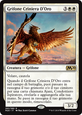 | Rules | Flying, vigilance When Goldmane Griffin enters the battlefield, you may search your library and/or graveyard for a card named Ajani, Inspiring Leader, reveal it, and put it into your hand. If you search your library this way, shuffle. |