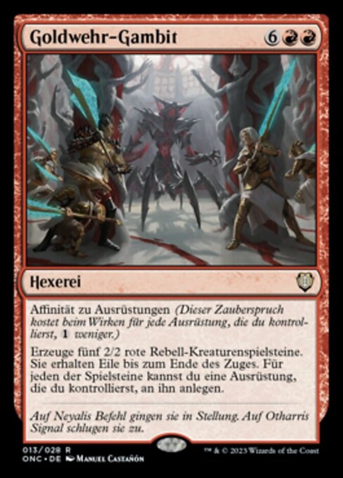 | Rules | Affinity for Equipment (This spell costs less to cast for each Equipment you control.) Create five 2/2 red Rebel creature tokens. They gain haste until end of turn. For each of those tokens, you may attach an Equipment you control to it. |