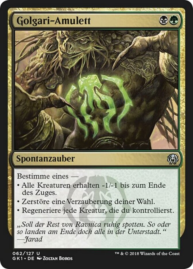 | Rules | Choose one — • All creatures get -1/-1 until end of turn. • Destroy target enchantment. • Regenerate each creature you control. |