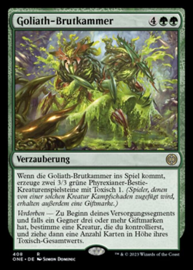 | Rules | When Goliath Hatchery enters the battlefield, create two 3/3 green Phyrexian Beast creature tokens with toxic 1. (Players dealt combat damage by them also get a poison counter.) Corrupted — At the beginning of your upkeep, if an opponent has three or more poison counters, choose a creature you control, then draw cards equal to its total toxic value. |