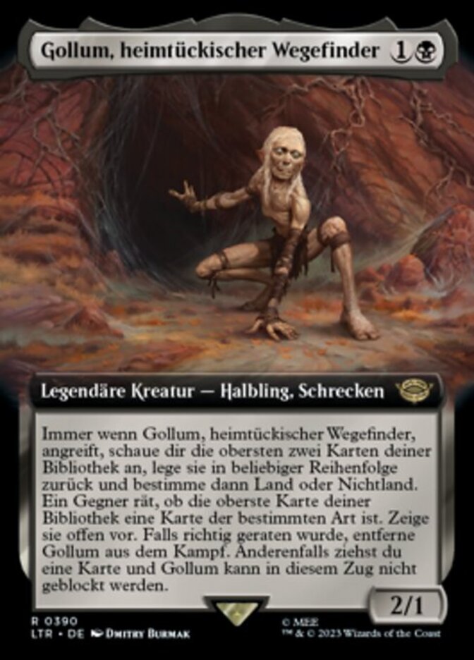 | Rules | Whenever Gollum, Scheming Guide attacks, look at the top two cards of your library, put them back in any order, then choose land or nonland. An opponent guesses whether the top card of your library is the chosen kind. Reveal that card. If they guessed right, remove Gollum from combat. Otherwise, you draw a card and Gollum can't be blocked this turn. |