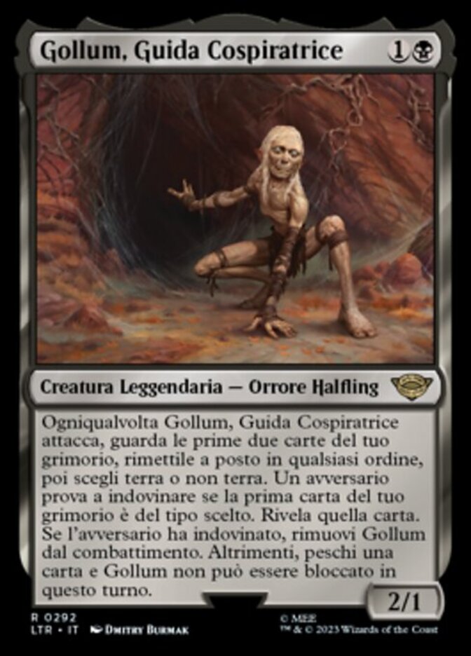 | Rules | Whenever Gollum, Scheming Guide attacks, look at the top two cards of your library, put them back in any order, then choose land or nonland. An opponent guesses whether the top card of your library is the chosen kind. Reveal that card. If they guessed right, remove Gollum from combat. Otherwise, you draw a card and Gollum can't be blocked this turn. |