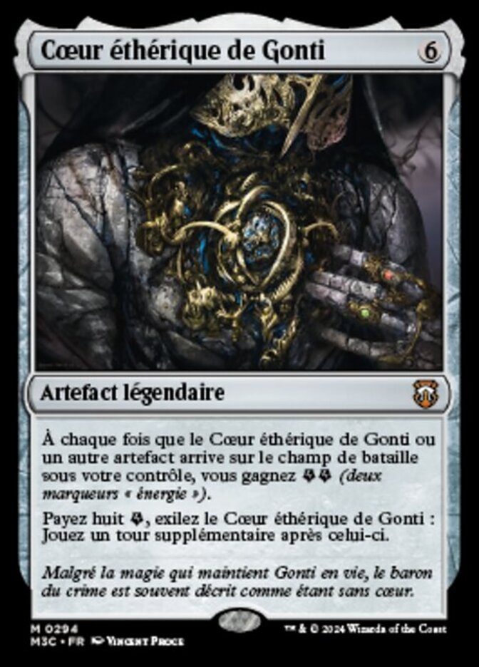 | Rules | Whenever Gonti's Aether Heart or another artifact enters the battlefield under your control, you get (two energy counters). Pay , Exile Gonti's Aether Heart: Take an extra turn after this one. |