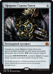 | Rules | Whenever Gonti's Aether Heart or another artifact enters the battlefield under your control, you get (two energy counters). Pay , Exile Gonti's Aether Heart: Take an extra turn after this one. |