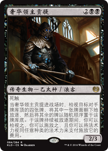 | Rules | Deathtouch When Gonti, Lord of Luxury enters the battlefield, look at the top four cards of target opponent's library, exile one of them face down, then put the rest on the bottom of that library in a random order. You may look at and cast that card for as long as it remains exiled, and you may spend mana as though it were mana of any type to cast that spell. |