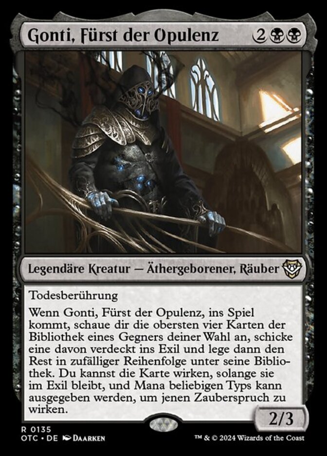 | Rules | Deathtouch When Gonti, Lord of Luxury enters the battlefield, look at the top four cards of target opponent's library, exile one of them face down, then put the rest on the bottom of that library in a random order. You may look at and cast that card for as long as it remains exiled, and you may spend mana as though it were mana of any type to cast that spell. |