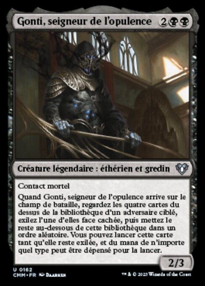 | Rules | Deathtouch When Gonti, Lord of Luxury enters the battlefield, look at the top four cards of target opponent's library, exile one of them face down, then put the rest on the bottom of that library in a random order. You may look at and cast that card for as long as it remains exiled, and you may spend mana as though it were mana of any type to cast that spell. |