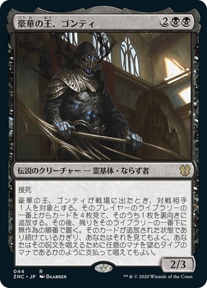 | Rules | Deathtouch When Gonti, Lord of Luxury enters the battlefield, look at the top four cards of target opponent's library, exile one of them face down, then put the rest on the bottom of that library in a random order. You may look at and cast that card for as long as it remains exiled, and you may spend mana as though it were mana of any type to cast that spell. |