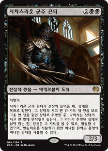 | Rules | Deathtouch When Gonti, Lord of Luxury enters the battlefield, look at the top four cards of target opponent's library, exile one of them face down, then put the rest on the bottom of that library in a random order. You may look at and cast that card for as long as it remains exiled, and you may spend mana as though it were mana of any type to cast that spell. |