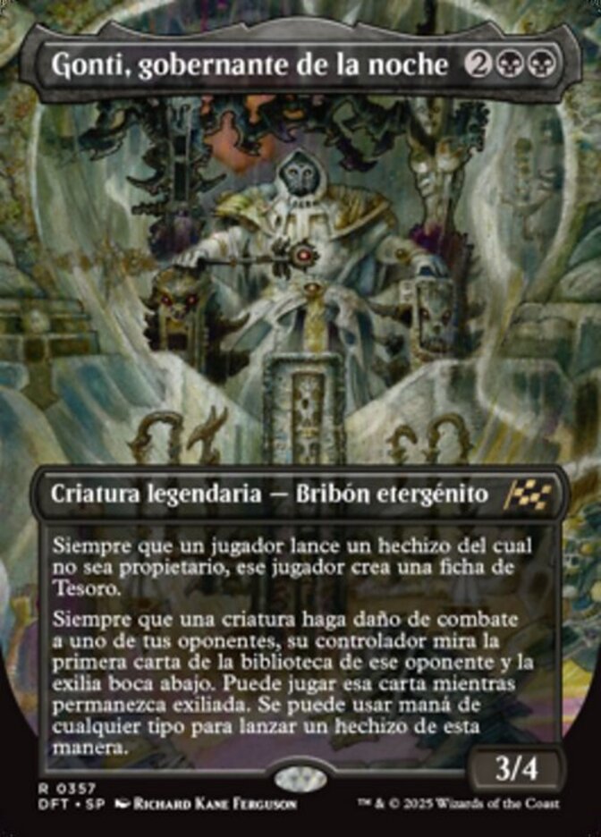 | Rules | Whenever a player casts a spell they don't own, that player creates a Treasure token. Whenever a creature deals combat damage to one of your opponents, its controller looks at the top card of that opponent's library and exiles it face down. They may play that card for as long as it remains exiled. Mana of any type can be spent to cast a spell this way. |