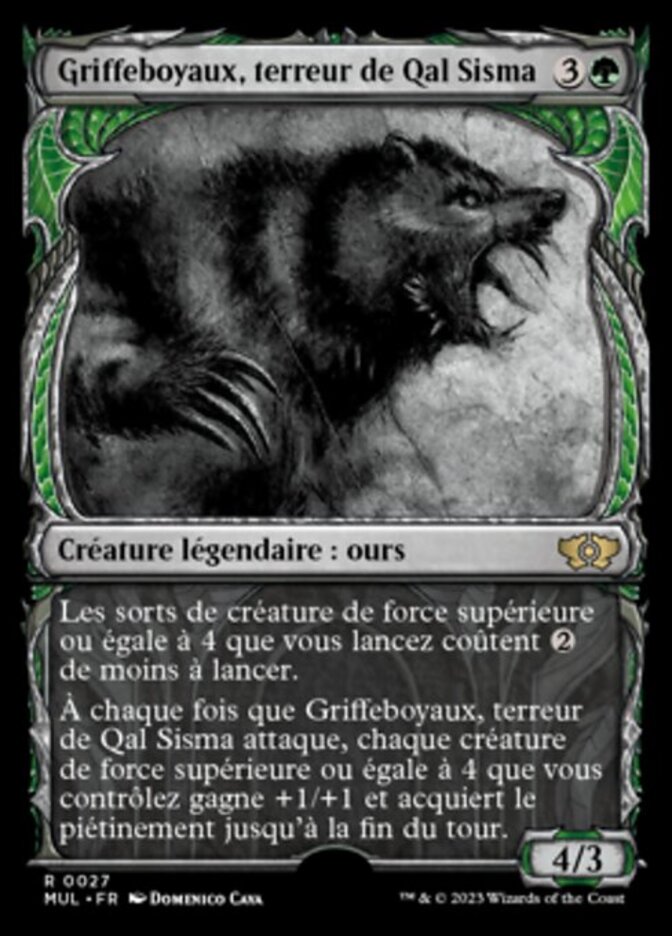 | Rules | Creature spells you cast with power 4 or greater cost less to cast. Whenever Goreclaw, Terror of Qal Sisma attacks, each creature you control with power 4 or greater gets +1/+1 and gains trample until end of turn. |