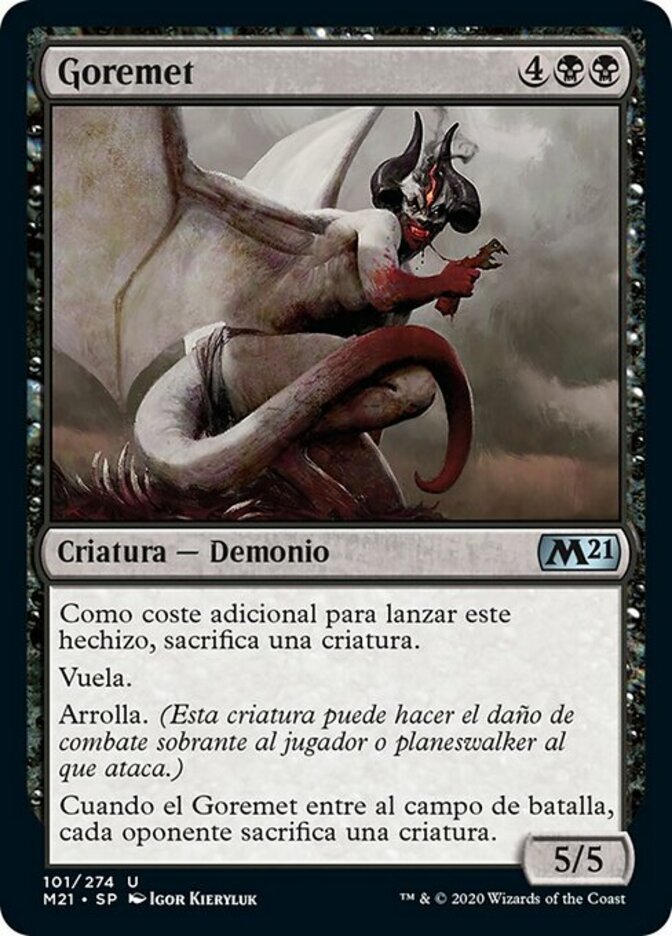 | Rules | As an additional cost to cast this spell, sacrifice a creature. Flying Trample (This creature can deal excess combat damage to the player or planeswalker it's attacking.) When Goremand enters the battlefield, each opponent sacrifices a creature. |