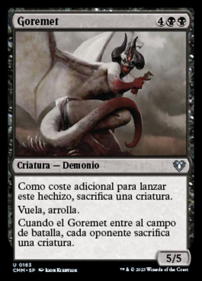 | Rules | As an additional cost to cast this spell, sacrifice a creature. Flying Trample (This creature can deal excess combat damage to the player or planeswalker it's attacking.) When Goremand enters the battlefield, each opponent sacrifices a creature. |