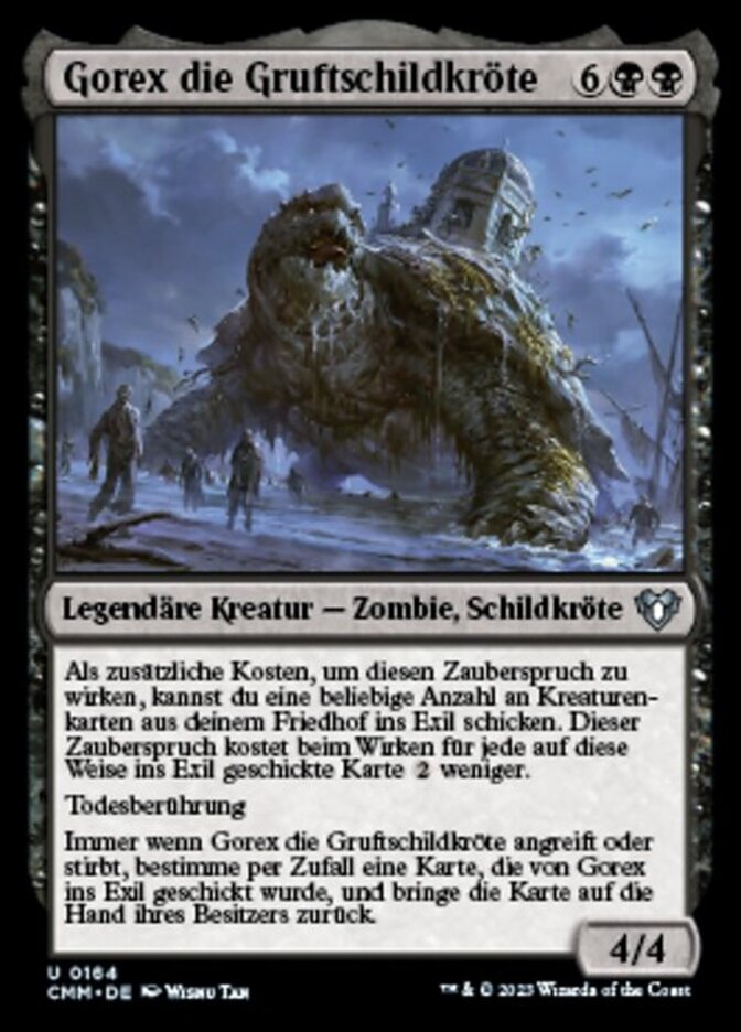 | Rules | As an additional cost to cast this spell, you may exile any number of creature cards from your graveyard. This spell costs less to cast for each card exiled this way. Deathtouch Whenever Gorex, the Tombshell attacks or dies, choose a card at random exiled with Gorex and put that card into its owner's hand. |