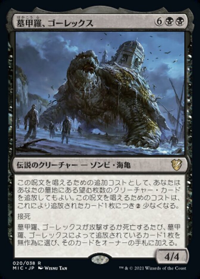 | Rules | As an additional cost to cast this spell, you may exile any number of creature cards from your graveyard. This spell costs less to cast for each card exiled this way. Deathtouch Whenever Gorex, the Tombshell attacks or dies, choose a card at random exiled with Gorex and put that card into its owner's hand. |