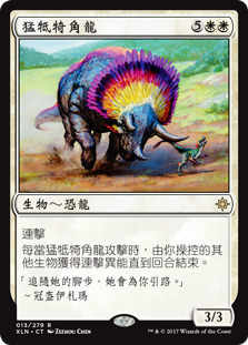 | Rules | Double strike Whenever Goring Ceratops attacks, other creatures you control gain double strike until end of turn. |
