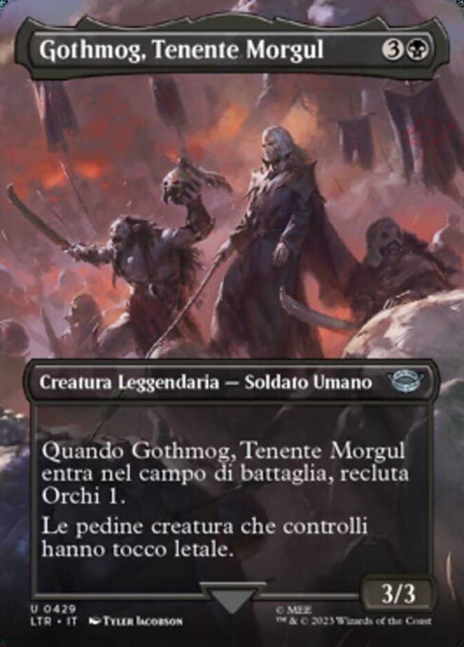 | Rules | When Gothmog, Morgul Lieutenant enters the battlefield, amass Orcs 1. (Put a +1/+1 counter on an Army you control. It's also an Orc. If you don't control an Army, create a 0/0 black Orc Army creature token first.) Creature tokens you control have deathtouch. |