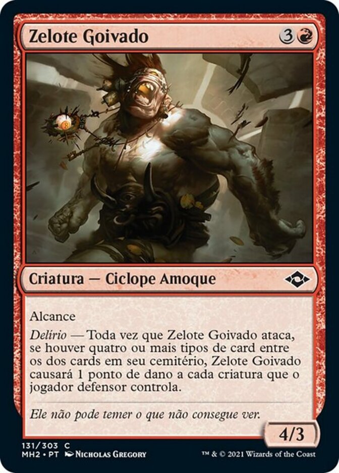 | Rules | Reach Delirium — Whenever Gouged Zealot attacks, if there are four or more card types among cards in your graveyard, Gouged Zealot deals 1 damage to each creature defending player controls. |
