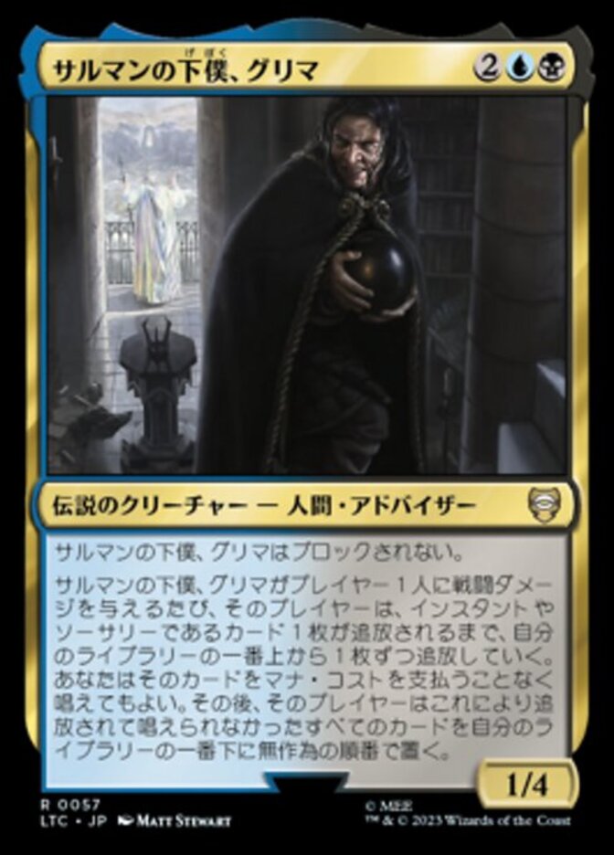 | Rules | Gríma, Saruman's Footman can't be blocked. Whenever Gríma deals combat damage to a player, that player exiles cards from the top of their library until they exile an instant or sorcery card. You may cast that card without paying its mana cost. Then that player puts the exiled cards that weren't cast this way on the bottom of their library in a random order. |
