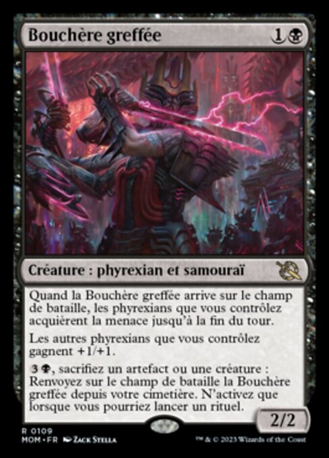 | Rules | When Grafted Butcher enters the battlefield, Phyrexians you control gain menace until end of turn. Other Phyrexians you control get +1/+1. , Sacrifice an artifact or creature: Return Grafted Butcher from your graveyard to the battlefield. Activate only as a sorcery. |