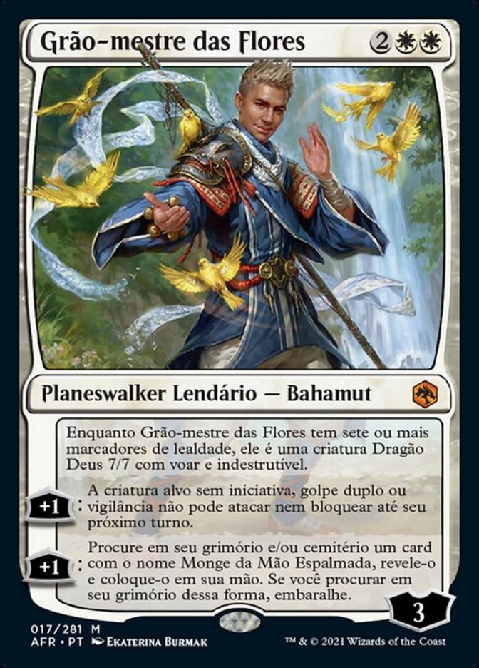 | Rules | As long as Grand Master of Flowers has seven or more loyalty counters on him, he's a 7/7 Dragon God creature with flying and indestructible. +1: Target creature without first strike, double strike, or vigilance can't attack or block until your next turn. +1: Search your library and/or graveyard for a card named Monk of the Open Hand, reveal it, and put it into your hand. If you search your library this way, shuffle. |