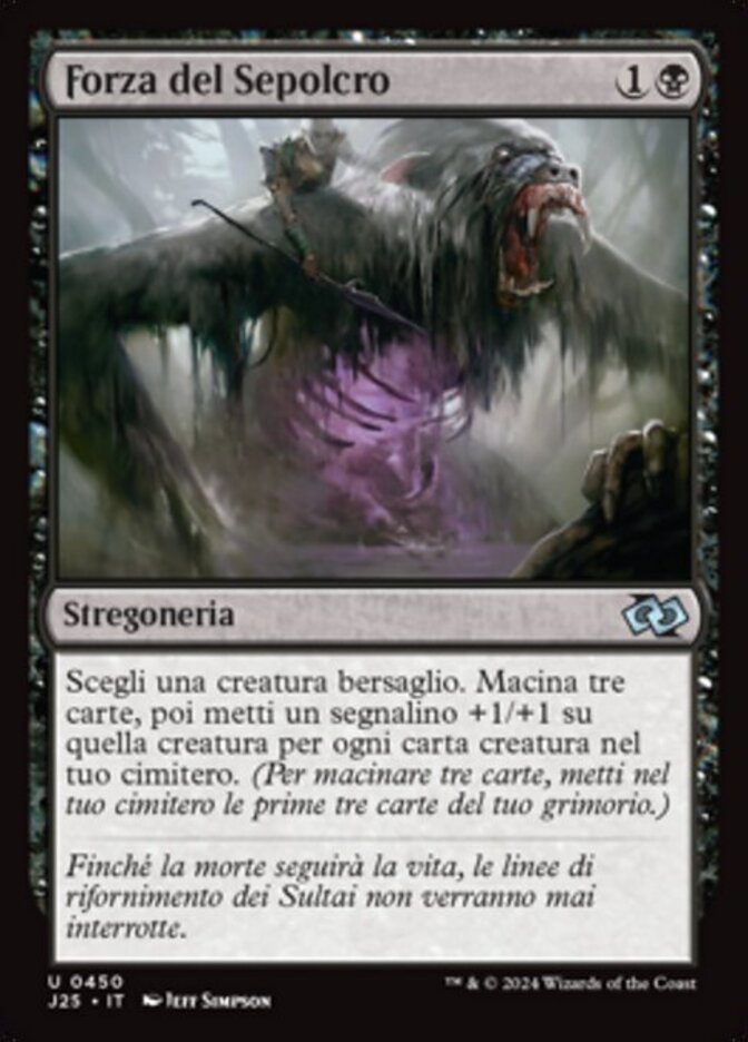 | Rules | Choose target creature. Mill three cards, then put a +1/+1 counter on that creature for each creature card in your graveyard. |