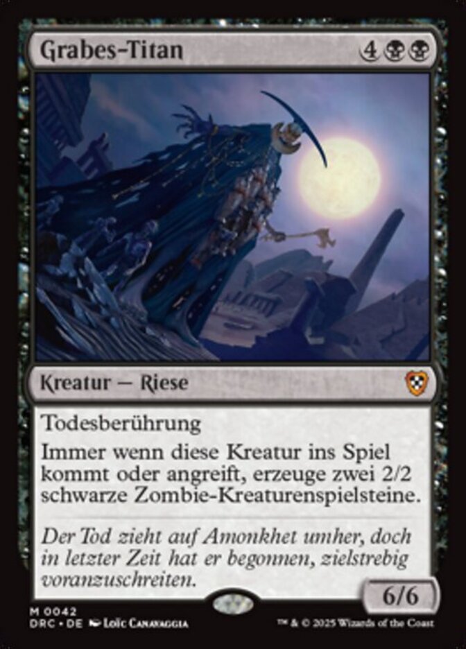 | Rules | Deathtouch Whenever Grave Titan enters the battlefield or attacks, create two 2/2 black Zombie creature tokens. |