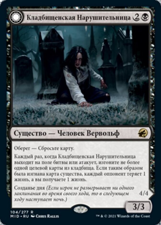 | Rules | Ward—Discard a card. Whenever Graveyard Trespasser enters the battlefield or attacks, exile up to one target card from a graveyard. If a creature card was exiled this way, each opponent loses 1 life and you gain 1 life. Daybound (If a player casts no spells during their own turn, it becomes night next turn.) // Ward—Discard a card. Whenever Graveyard Glutton enters the battlefield or attacks, exile up to two target cards from graveyards. For each creature card exiled this way, each opponent loses 1 life and you gain 1 life. Nightbound (If a player casts at least two spells during their own turn, it becomes day next turn.) |