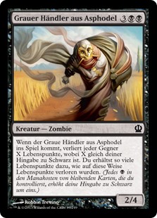 | Rules | When Gray Merchant of Asphodel enters the battlefield, each opponent loses X life, where X is your devotion to black. You gain life equal to the life lost this way. (Each in the mana costs of permanents you control counts toward your devotion to black.) |