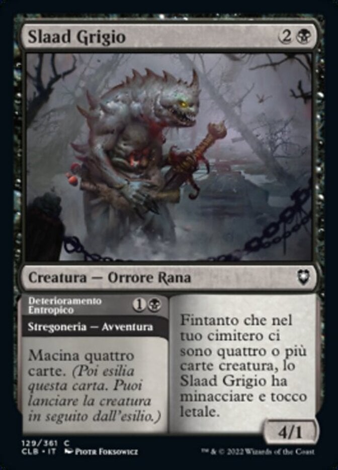 | Rules | As long as there are four or more creature cards in your graveyard, Gray Slaad has menace and deathtouch. // Mill four cards. (Then exile this card. You may cast the creature later from exile.) |