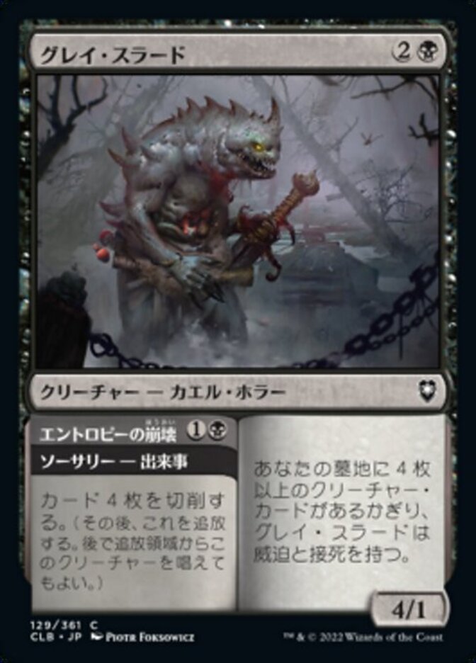 | Rules | As long as there are four or more creature cards in your graveyard, Gray Slaad has menace and deathtouch. // Mill four cards. (Then exile this card. You may cast the creature later from exile.) |