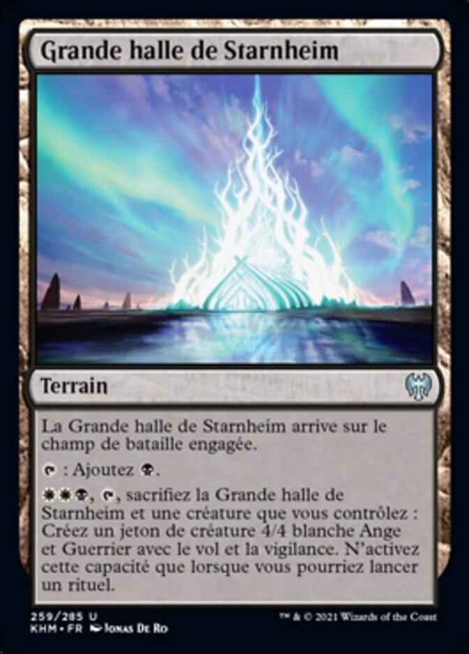 | Rules | Great Hall of Starnheim enters the battlefield tapped. : Add . , , Sacrifice Great Hall of Starnheim and a creature you control: Create a 4/4 white Angel Warrior creature token with flying and vigilance. Activate only as a sorcery. |