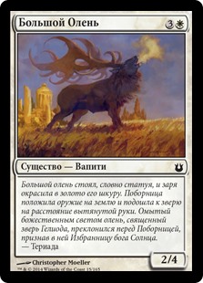 | Flavor | The great hart stood like a statue, its hide painted gold by the dawn. The Champion laid down her weapons and stepped forward within an arm's length of the beast. The hart, sacred to Heliod and bathed in the god's own light, bowed to the Champion, marking her as the Chosen of the Sun God. -The Theriad |