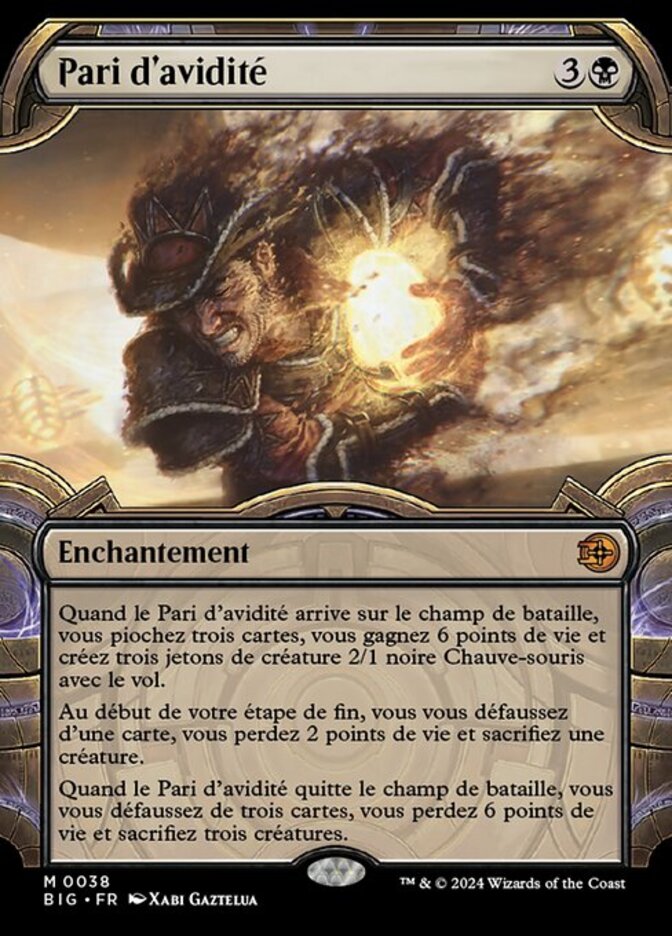 | Rules | When Greed's Gambit enters the battlefield, you draw three cards, gain 6 life, and create three 2/1 black Bat creature tokens with flying. At the beginning of your end step, you discard a card, lose 2 life, and sacrifice a creature. When Greed's Gambit leaves the battlefield, you discard three cards, lose 6 life, and sacrifice three creatures. |