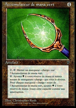 | Rules | , : Put a charge counter on Green Mana Battery. , Remove any number of charge counters from Green Mana Battery: Add , then add an additional for each charge counter removed this way. |