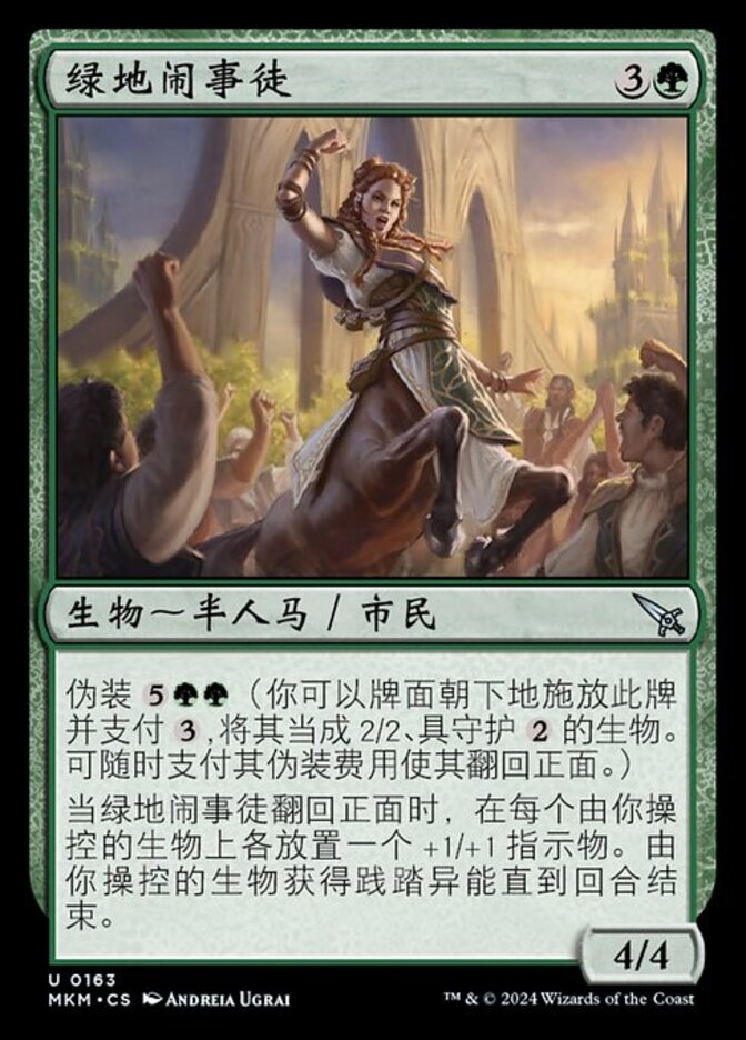 | Rules | Disguise (You may cast this card face down for as a 2/2 creature with ward . Turn it face up any time for its disguise cost.) When Greenbelt Radical is turned face up, put a +1/+1 counter on each creature you control. Creatures you control gain trample until end of turn. |